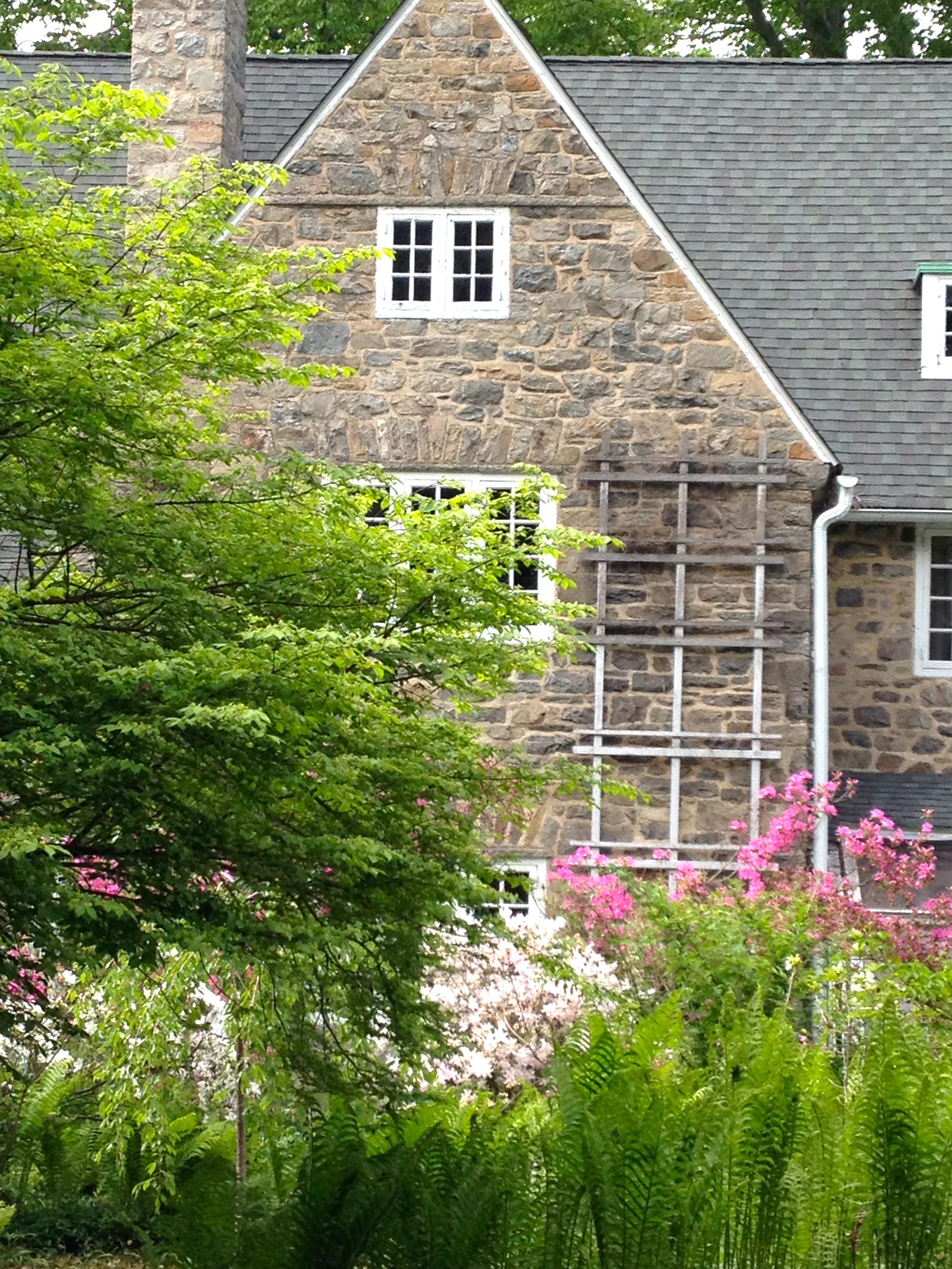 IMG_4466I think we all probably associate certain plants with particular events and people in our lives. The smell of pear blossoms or pine bows, hyacinths or lilacs, can sweep me into the past as magically as a madeleine once transported Proust. I was struck by this recently when I went back to my home town in Pennsylvania for the funeral service of a beloved aunt. She’d been brought up, along with my father and five other siblings, in the beautiful stone Arts & Crafts house pictured here. Her mother, my grandmother, had been a passionate gardener and some of my earliest memories are of running through the magnificent rose garden she nurtured for decades in the backyard.