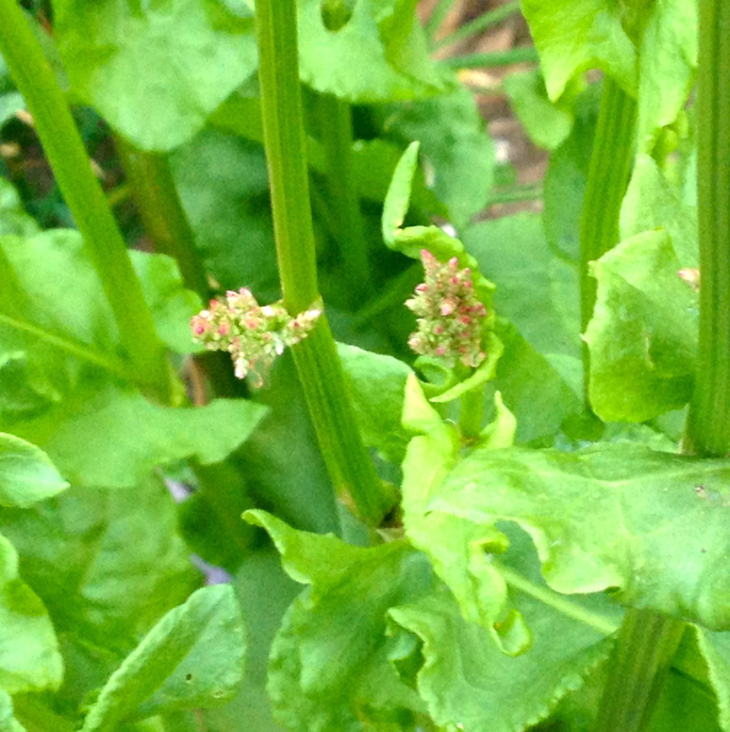 My sorrel was at it peak over Memorial Day weekend when I made the simple and quickly prepared sauce below which I served over seared sea scallops. But this early leafing herb is already starting to bolt, sending up red-seeded sprays three or four feet into the air. The sorrel itself is still good for cooking, just strip the leaves off the toughening ribs before using.