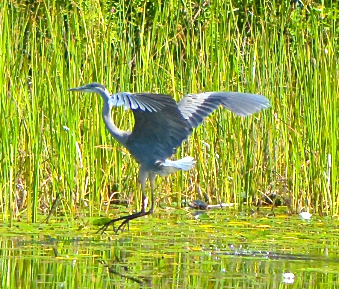 I’m talking about The Outlet which meanders for a half mile or so behind The Island, a protected nesting ground for Canada geese and frequently visited by blue herons, green herons, osprey, duck and other water fowl. Narrow as a canoe length in places, The Outlet opens up to a series of lovely lagoons, mostly covered with water lilies. On a sun-dappled morning last week, I kayaked through this serene, almost silent backwater where the only living things I encountered were turtles, geese, ducks, and a lone blue heron. Recent sitings also included an otter and a large black bear, loping along the shore.