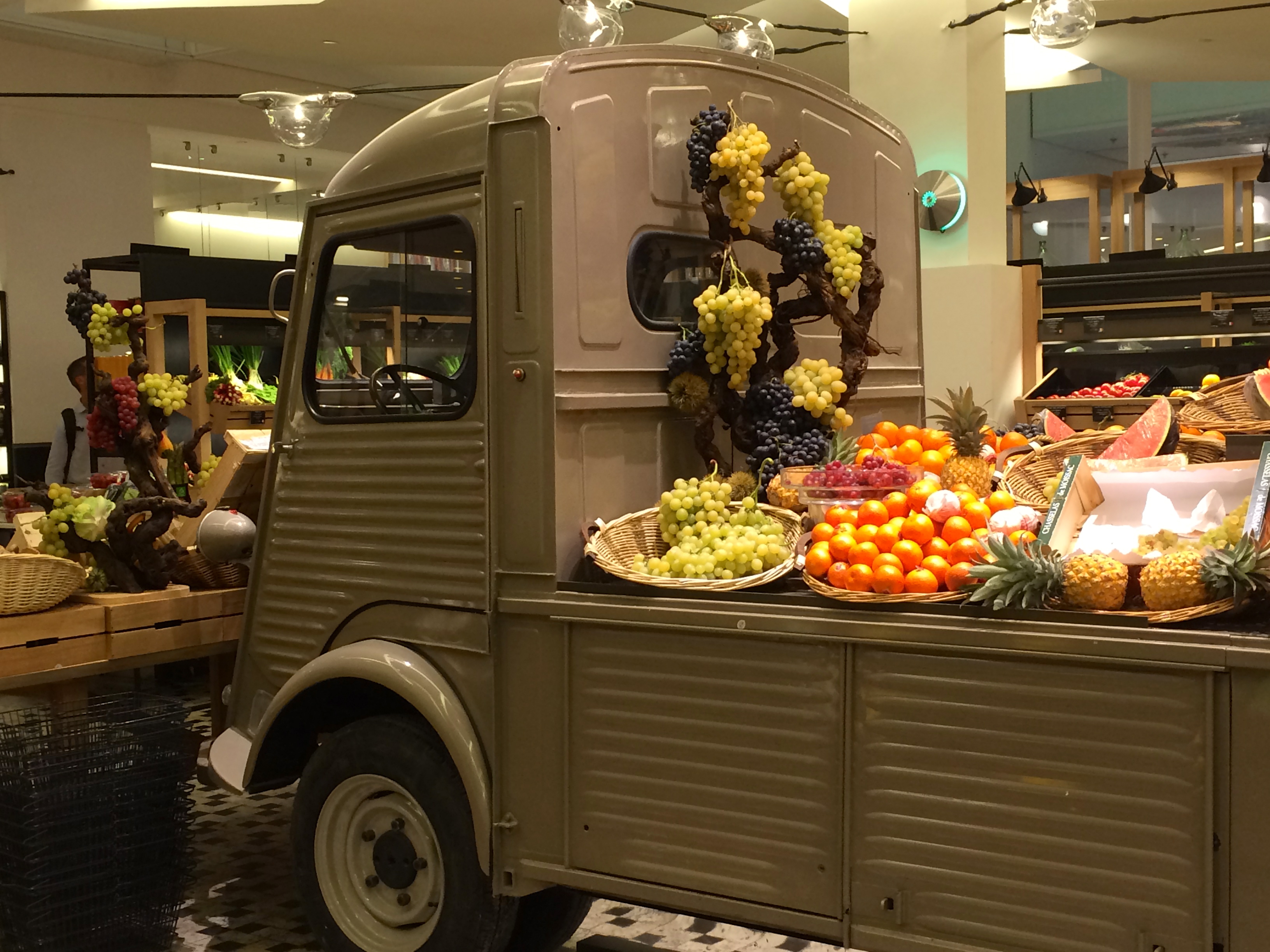 On a recent trip we strolled along the two-block traffic-free Rue Cler market in the shadow of the Eiffel Tower … visited the larger and tonier Marché Raspail in the heart of St. Germain which has a special all-organic market on Sundays … and explored the newly refurbished food courts at Bon Marché  — a culinary extravaganza which, though not outside, takes up an IMG_1192entire city block on the first floor of Paris’ most famous department store. Here, the displays are worthy of Broadway stage sets, including this full-size antique truck loaded with fruits de saison.