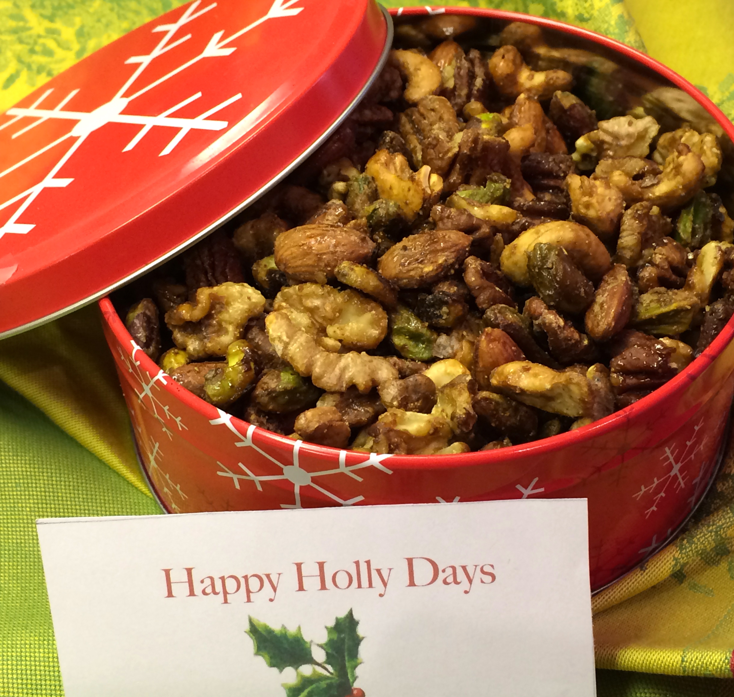 IMG_1538There’s nothing quite as tempting and delicious at a cocktail party as a handful of mixed nuts that have been roasted and spiced, though it’s unlikely you’ll be able stop at just one handful. My sister-in-law Beverly, a first-class cook and the embodiment of Southern hospitality, seems to travel with a tin of these nuts — freshly roasted and redolent of spices— wherever she goes. Luckily for us, she brought some with her to our place over Thanksgiving, and we served them with a cheese tray and white wine. They disappeared instantly.