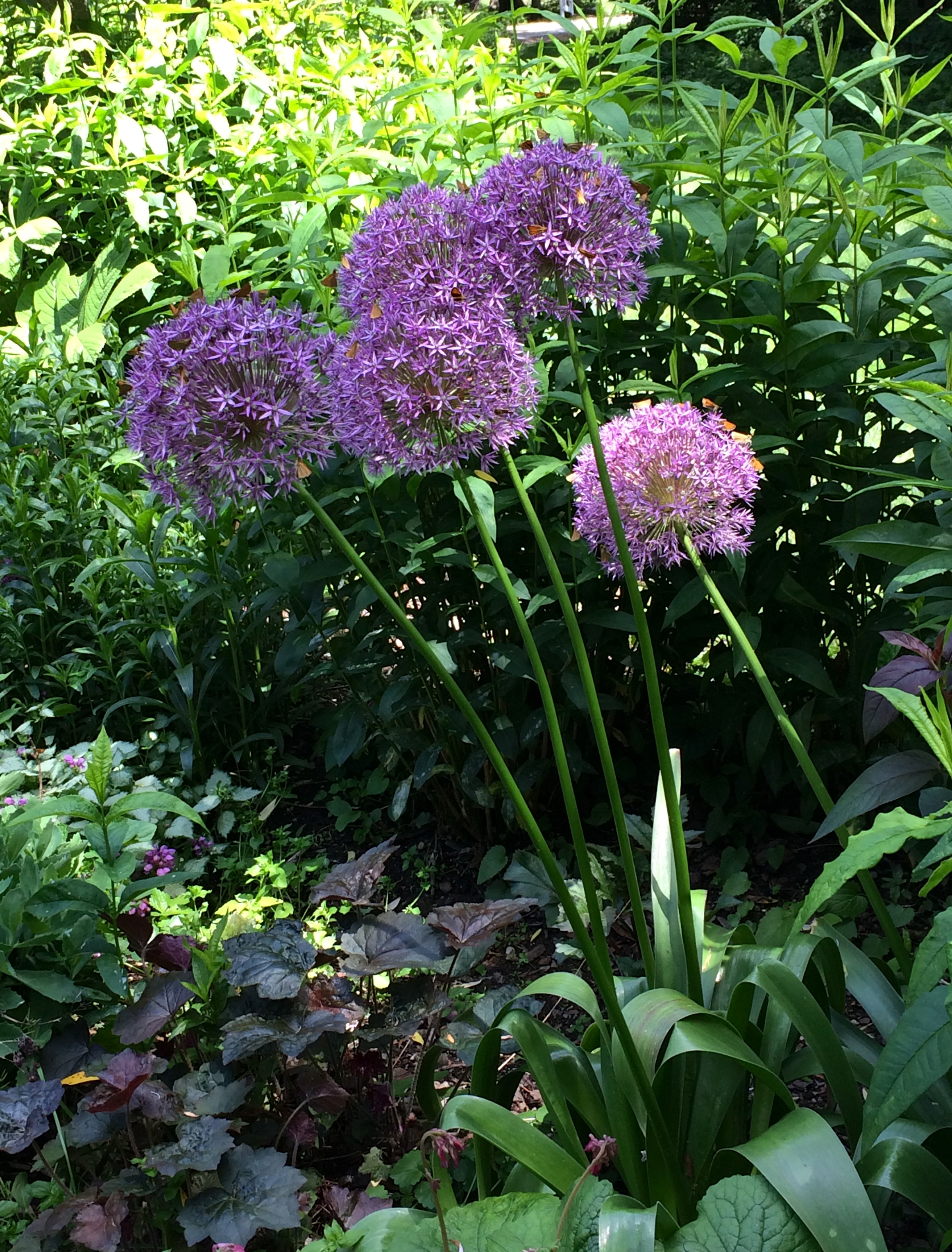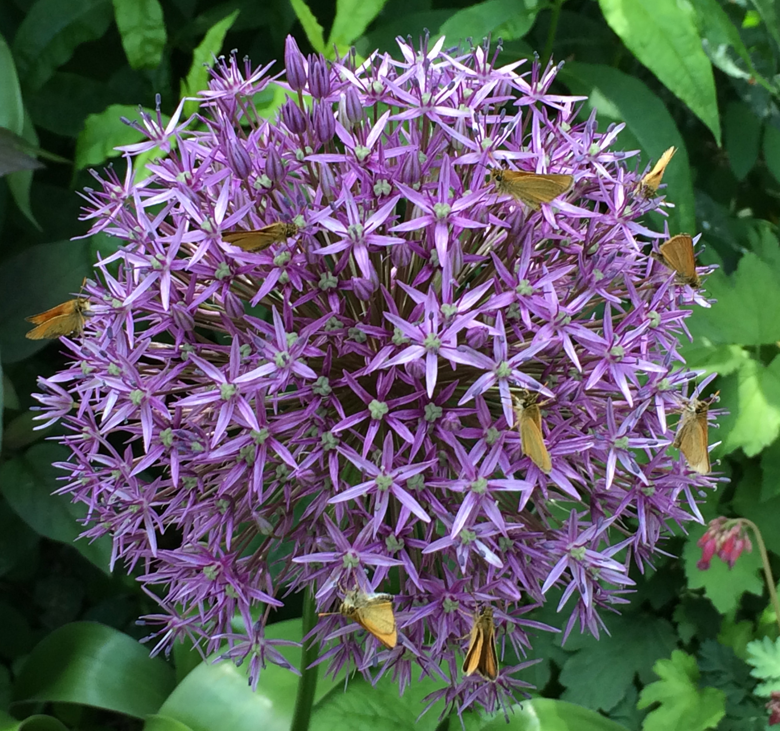 This week, though, I noticed what I thought at first were patches of rust on the densely packed florets that form the globes. But when I took a closer look, I realized that the Globemasters were covered with tiny orange butterflies about the size of a thumbnail. Though the butterflies could be found throughout the garden, fluttering around anything in bloom, they seemed particularly drawn to the purple lure — and perhaps oniony aroma — of the allium family. The bronze-colored butterflies, which I think are some variety of Folded-winged Skippers, are the perfect complement for the lavenders and purples of the alliums.