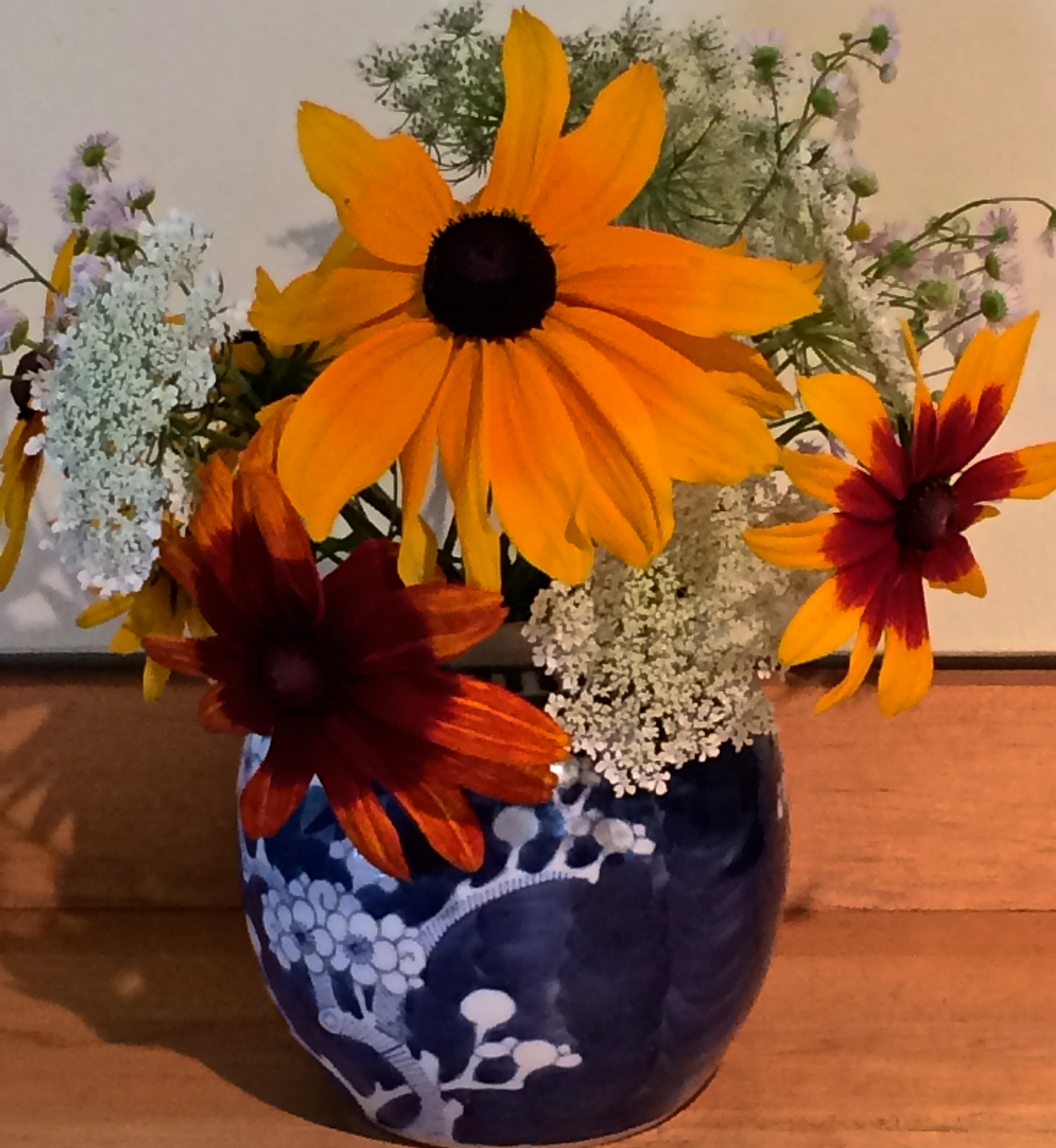Love your vase of flowers, in the blue and white . I pick wildflowers alongside the road to enjoy at home since I do not have the ability to have a garden. I also have a number of those blue and white vases, my favorite. My cats eat my plants , so am limited there too. Put them up high and out of reach.