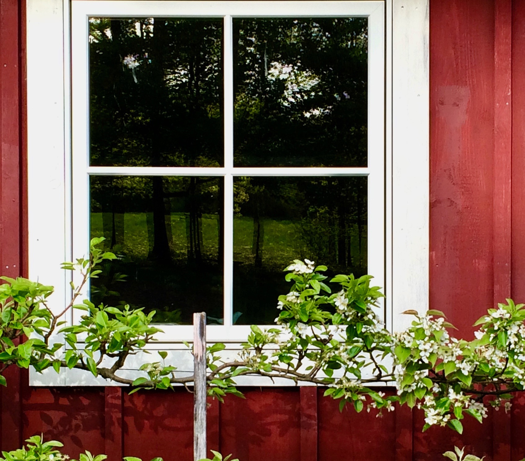 I was reminded of those opening lines of Nabokov’s poetic masterpiece Pale Fire recently as I watched a female cardinal batter herself against the window of our barn. She’d perch on the branch of the flowering pear espalier between bouts — then fling herself up against the glass with the messianic fervor of a true zealot. In the case of our cardinal, I’m sure the nesting season brought out her territorial instincts, and the reflection in the window looked to her like a predator. She was attacking herself. The good news is this behavior isn’t life-threatening. In fact, she’s stopped now, no doubt preoccupied with the care and feeding of her young. But, according to the Cornell Lab of Ornithology, most birds fly into windows because they see a reflection of the sky or trees — Nabokov’s “false azure” — leading to about a billion bird deaths in the U.S. every year. For information about what you can do to help prevent this slaughter visit: httpss://www.allaboutbirds.org/why-birds-hit-windows-and-how-you-can-help-prevent-it/
