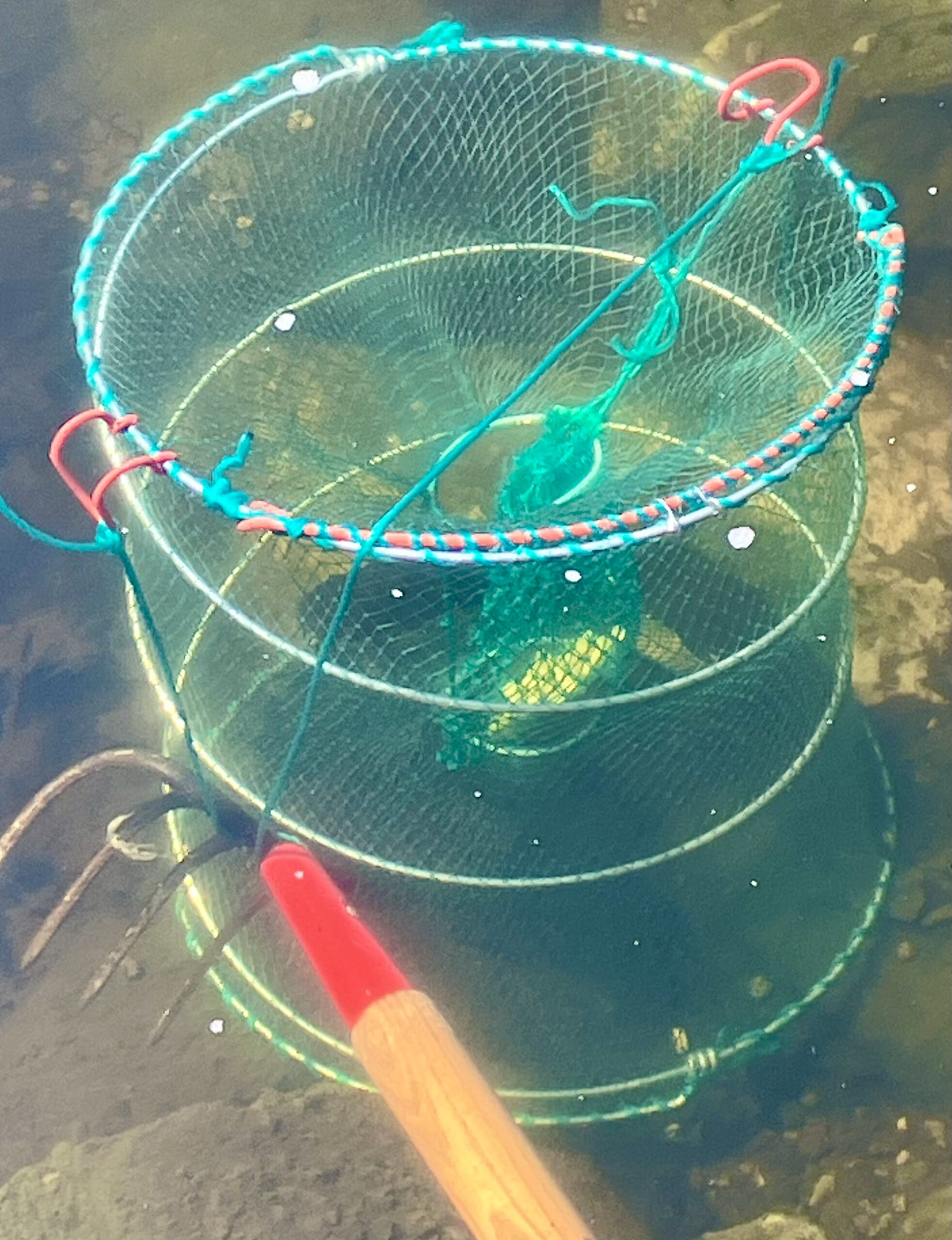 I knew I had to get them out. I tried to scoop them up with a butterfly net but they just darted away under the rocks. So I consulted the digital authorities, and ended up purchasing this crayfish trap, made in China of mostly green plastic twine. As recommended, I baited it with corn kernels and dropped it into the deepest part of the pond. The next morning, what turned out to be catfish (carp don’t have whiskers) were thrashing around inside. They’ve since been relocated to a nearby brook, but the mystery remained. How did they get into our frog pond in the first place?