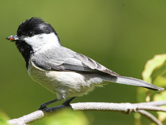 Could this chickadee be eating a berry of some kind based on the red object in his beak? Great photograph! I too have a fondness for the little ones whose songs are so easy to identify as they hide in the shade of trees.